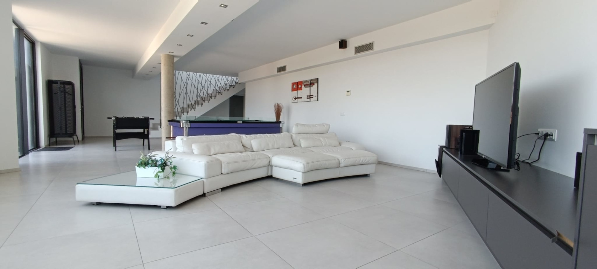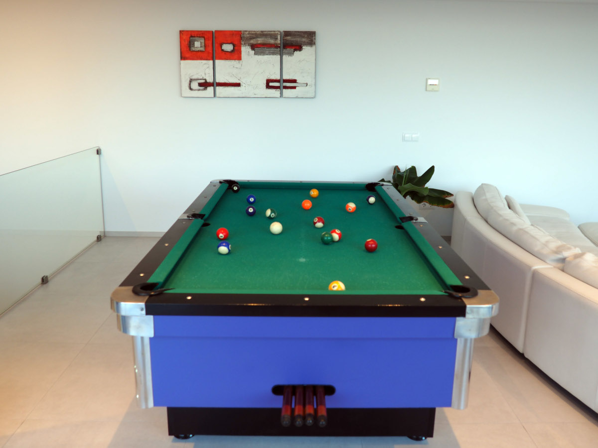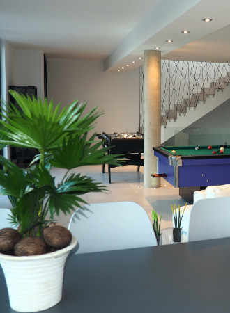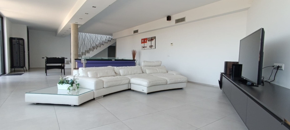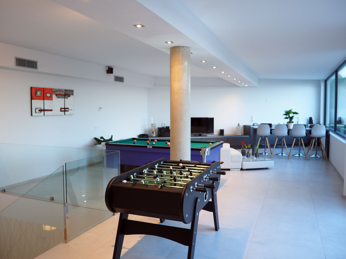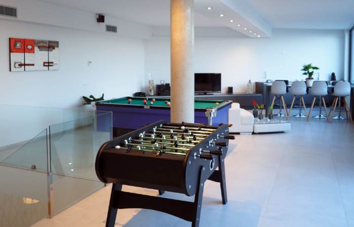 Casa LOU is a magnificent villa set on two levels. On the first level there is a large playroom where you can relax and have a good time with friends and family. At this level you find a full fitted kitchen (sink, fridge, hob), a flat screen with home theatre, game console, billiard, table football, and a cosy living room with a large and comfortable panoramic sectional sofa Il Teatro from Roche Bobois, ideal for napping! There is also a bathroom with natural stone on the wall, a shower, and an integrated WC.