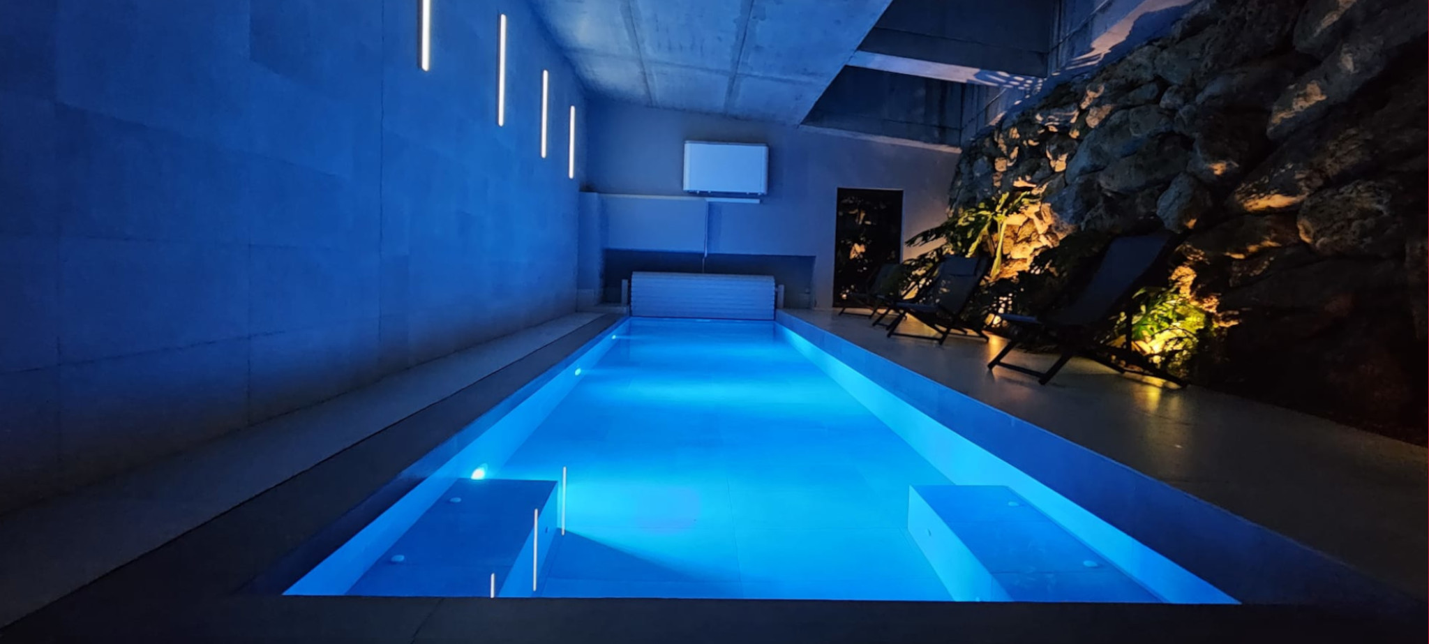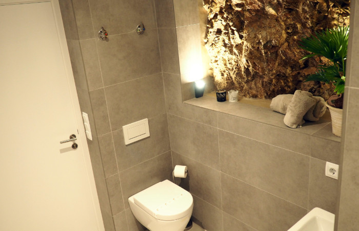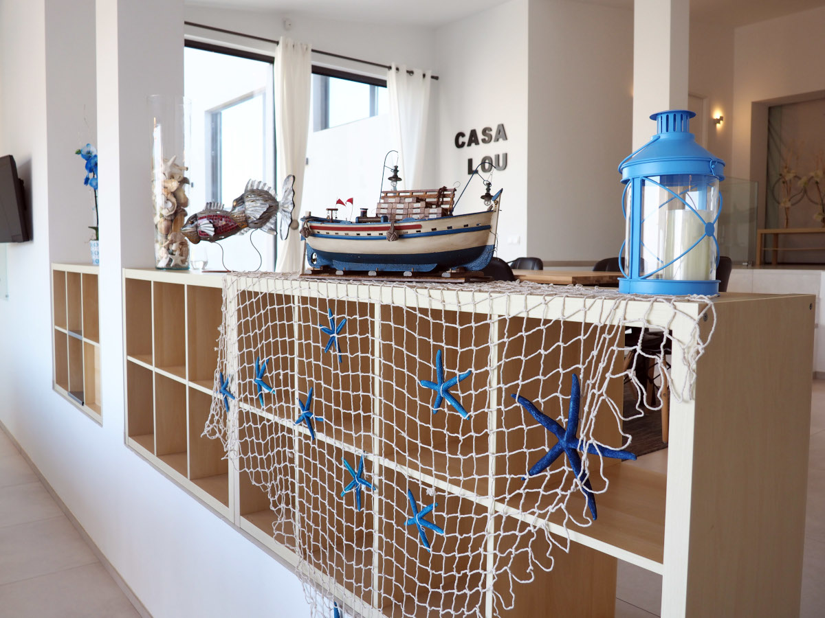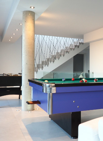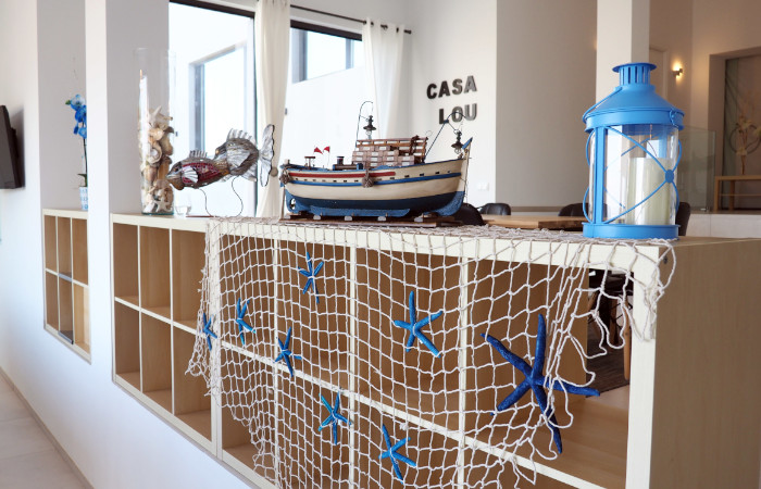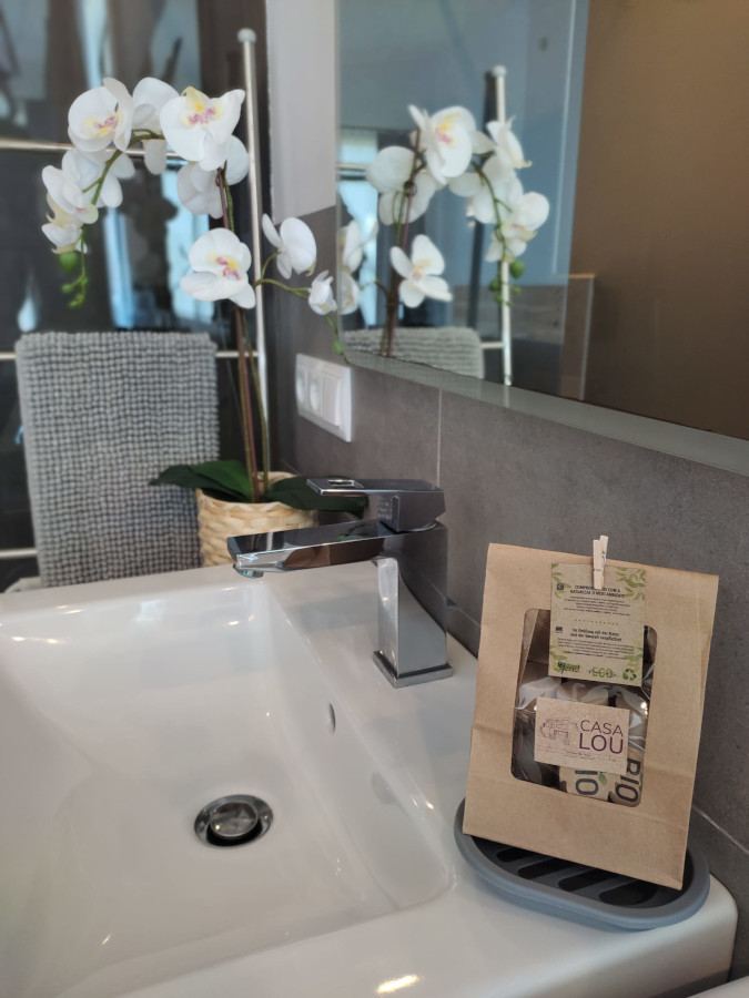 Casa LOU is a magnificent villa set on two levels. On the first level there is a large playroom where you can relax and have a good time with friends and family. At this level you find a full fitted kitchen (sink, fridge, hob), a flat screen with home theatre, game console, billiard, table football, and a cosy living room with a large and comfortable panoramic sectional sofa Il Teatro from Roche Bobois, ideal for napping! There is also a bathroom with natural stone on the wall, a shower, and an integrated WC.