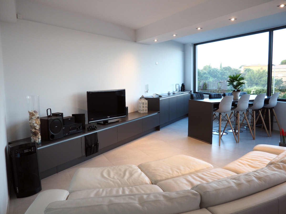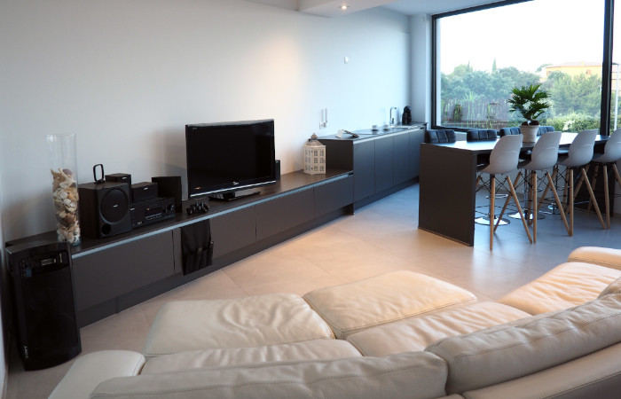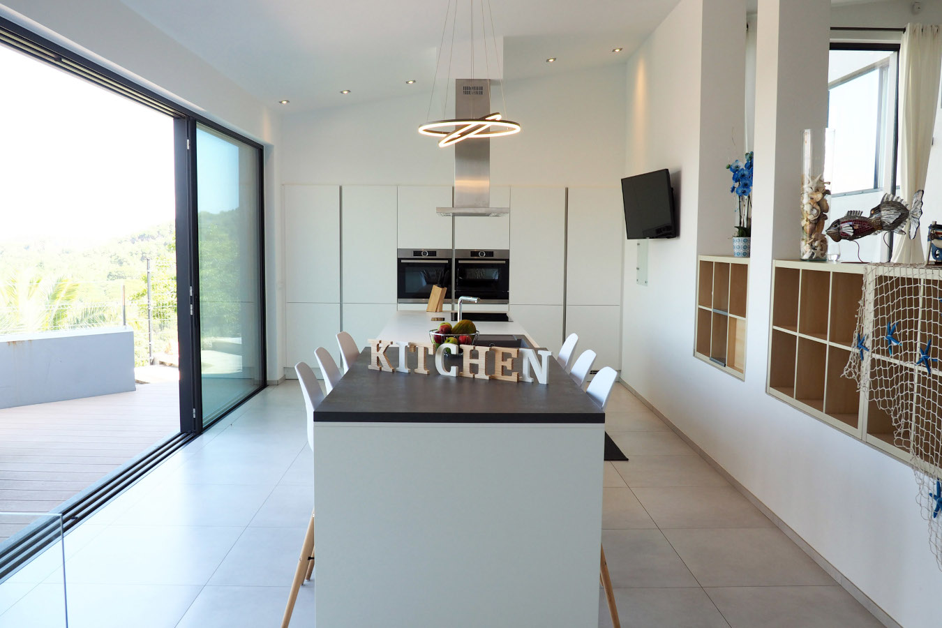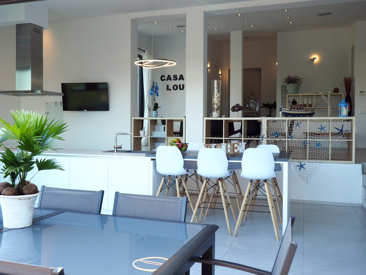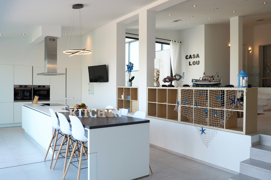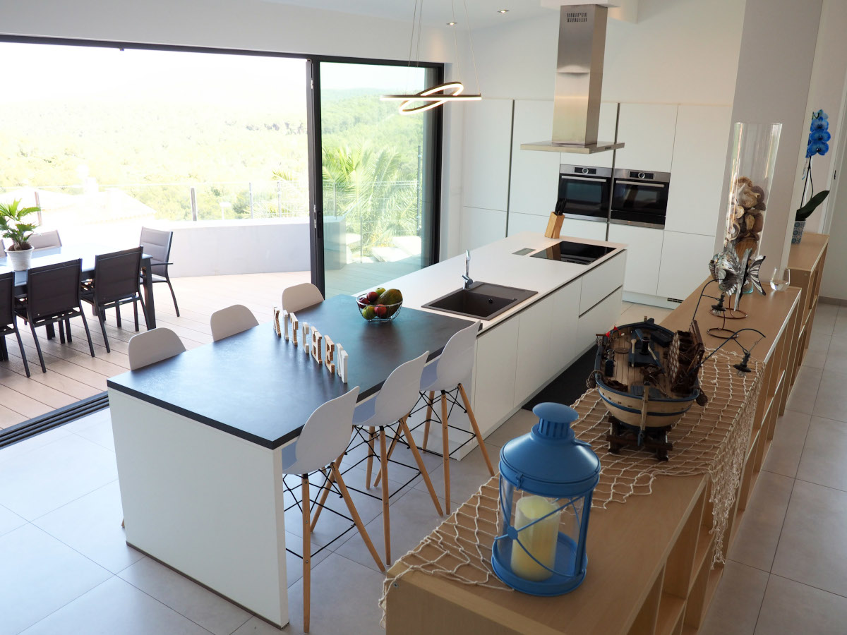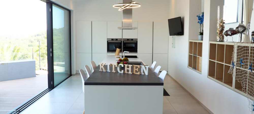 Fully equipped kitchen with double fridge and freezer, oven, microwave, dishwasher, coffee makers (Nespresso, Aeroccino, Dolce Gusto, De'Longhi) all the necessary utensils for day to day, and a beautiful 6 stool bar. The kitchen opens into a large terrace comprising an eight-seat dining table to enjoy your meals in front of a breath-taking view.