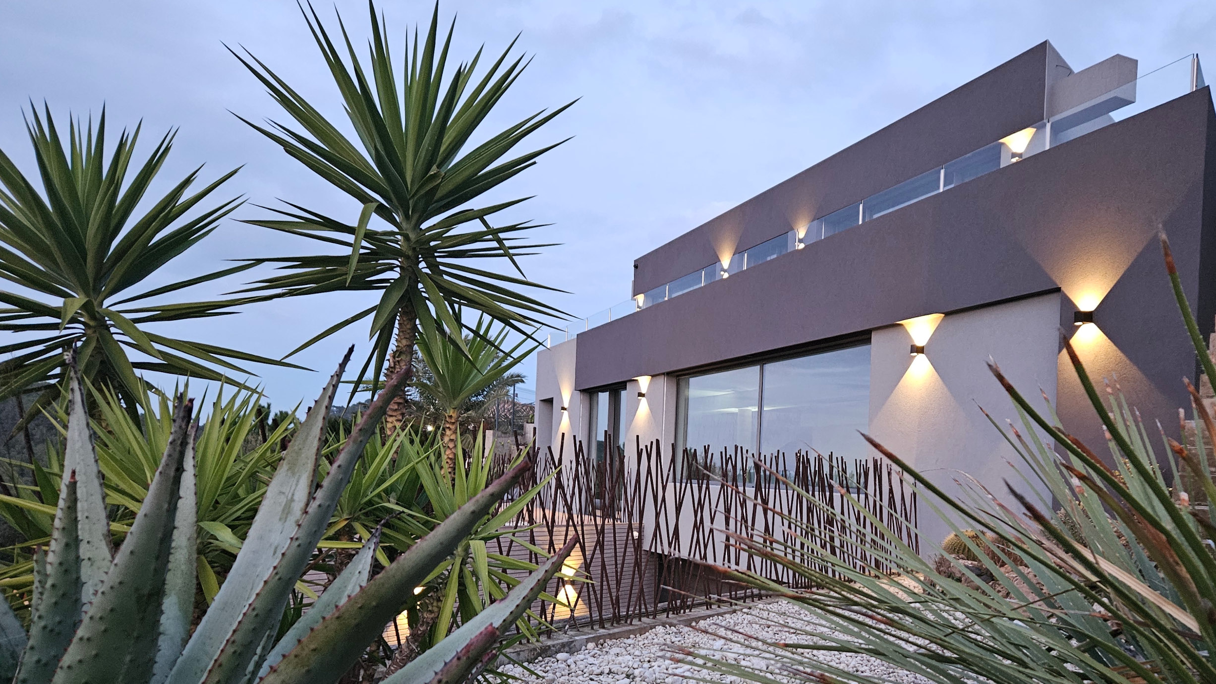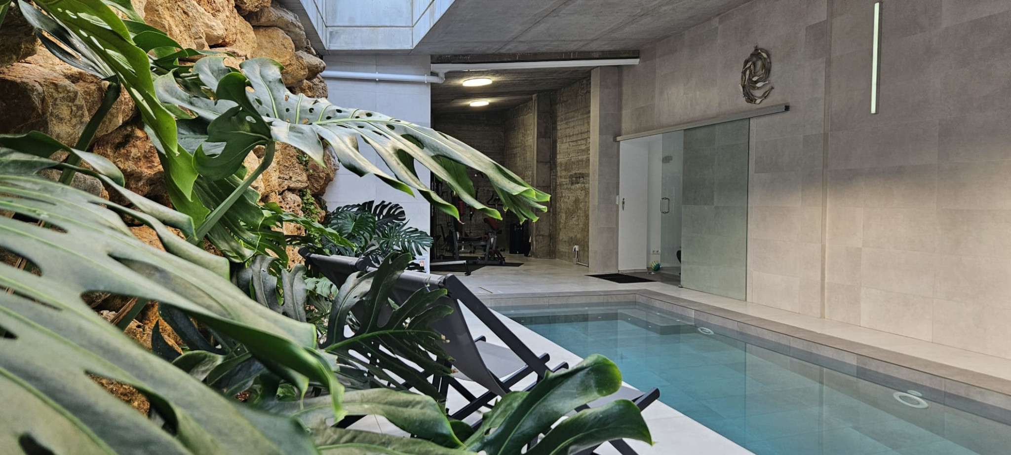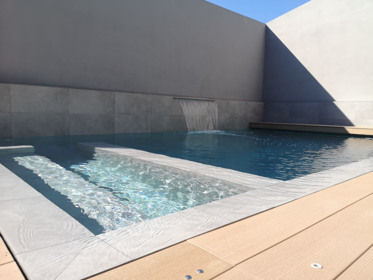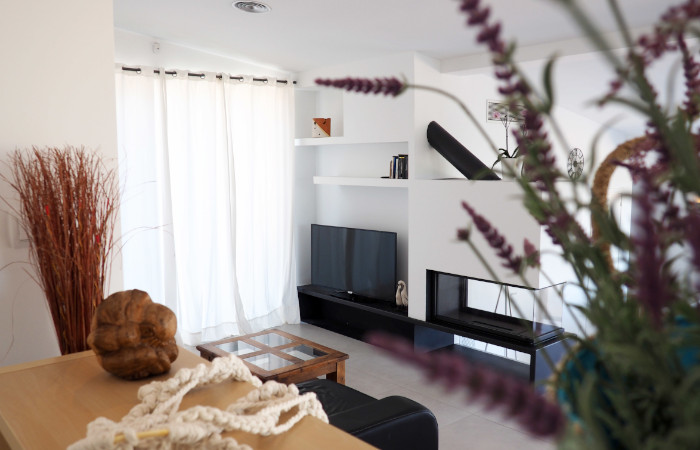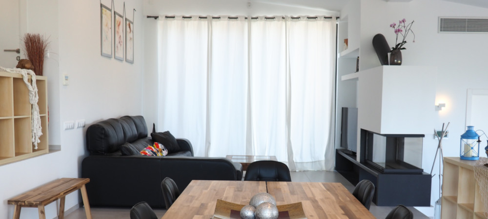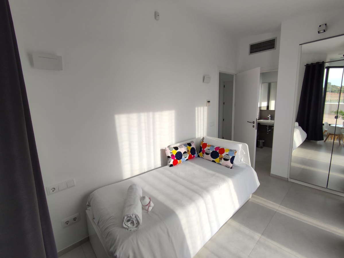 A staircase leads to the second level where you will find a spacious dining and living room with fireplace that opens into a large garden with barbecue on one side, and to the main terrace on the other side, where you will find a cosy corner sofa next to the designer heated pool with its waterfall and its integrated jacuzzi, an idyllic place to relax and sunbathe. Aside to the master suite you find the indoor pool area with the all-year heated pool of 10 x 3 meters with integrated air-flow based Jacuzzi and the fitness station. The private garden is completely fenced, being safe for the little ones to play at ease and enjoy of the trampoline.