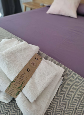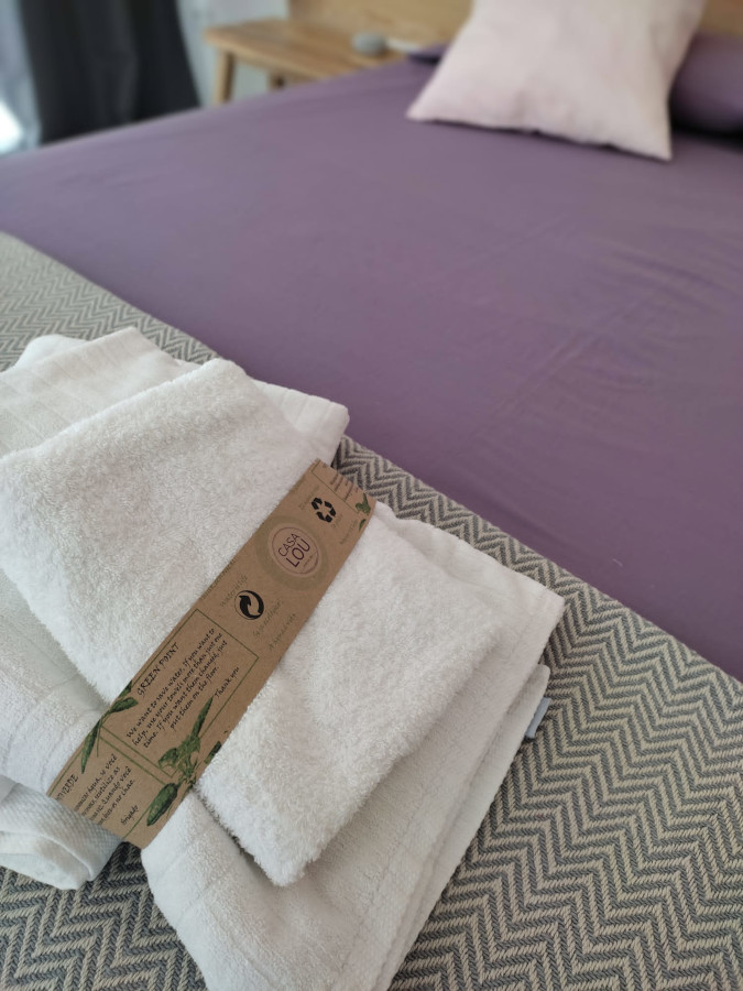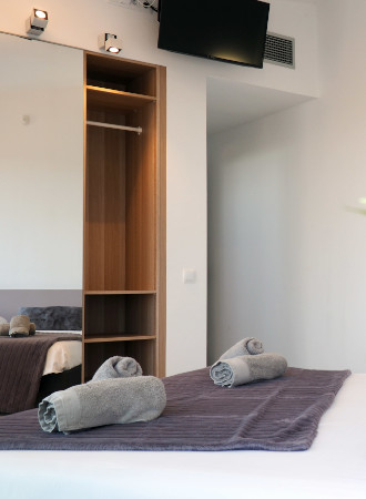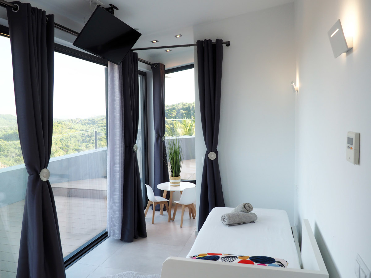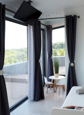 Suite IV has a cosy corner with 360° breathtaking views to the Pyrenees and Montgrí massif. It has two bunk beds, a 40" flat screen TV, adjustable air conditioning, and a small wardrobe. It has an en-suite bathroom, with its own walk-in rain shower, sink, and toilet. The sliding window opens to the same large terrace of Suite III. More extras include sheets, pillows, bedspread, bath towels, and individual bath soaps.